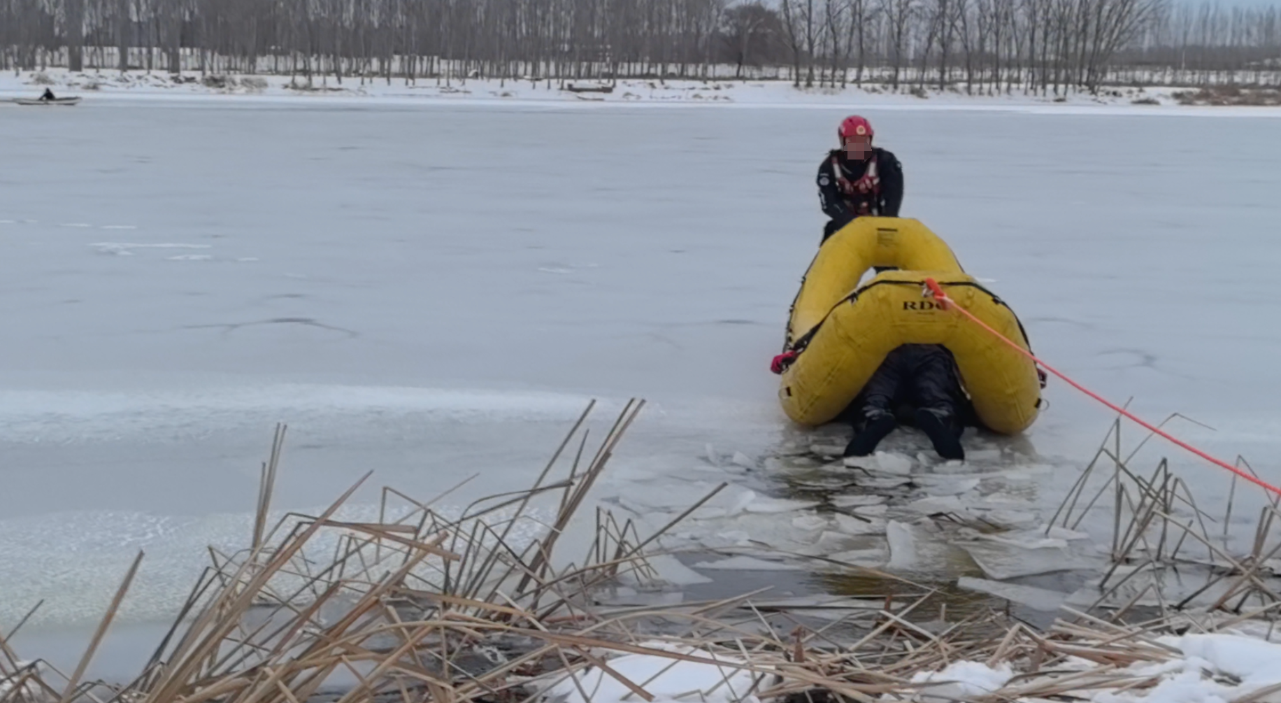 剛下河,冰面就破裂了,兩名消防員顧不上寒冷,從河水中爬出,毅然踏冰,抬著救生筏一步步朝著河中央進發(fā)。其間,兩人數(shù)度遭遇冰裂,他們便調(diào)整姿勢并利用船槳破冰劃行。岸上的消防員則一點點地釋放手中的繩索,緊緊關(guān)注著兩名隊友的狀態(tài)。