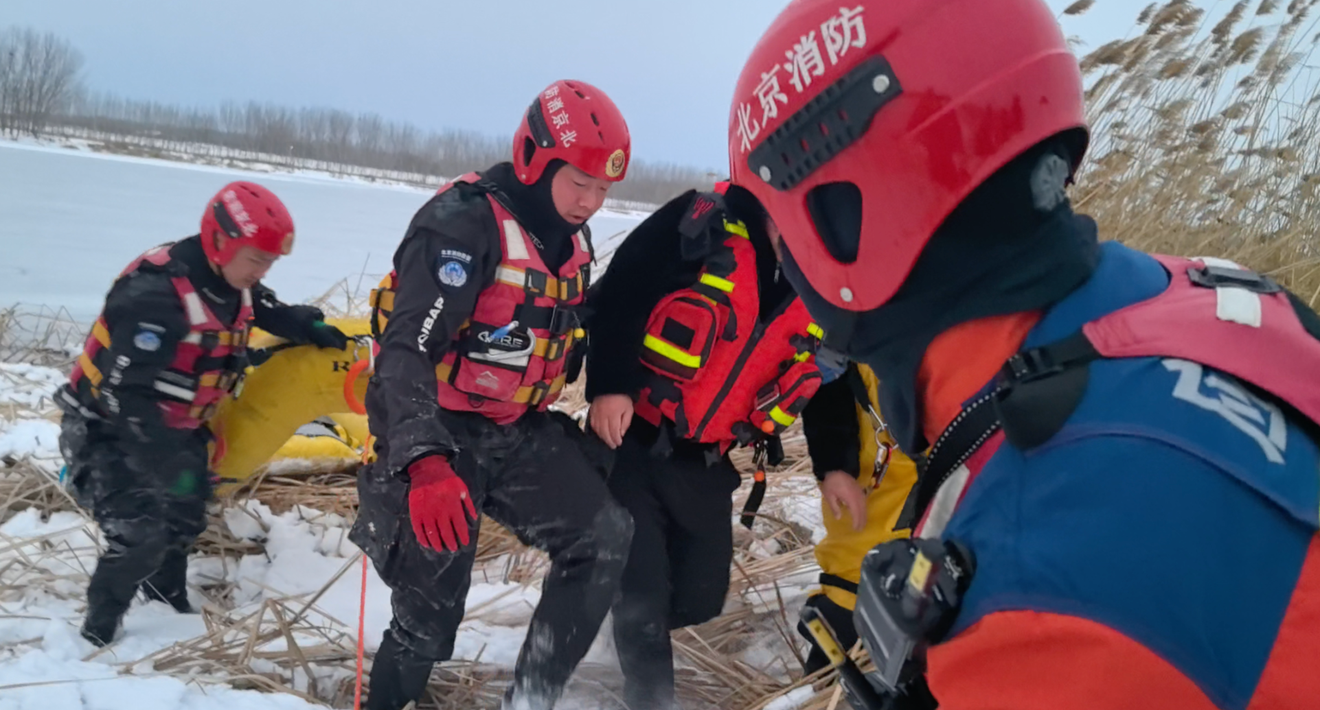 消防救援人員率先到場后發(fā)現(xiàn),事發(fā)河段位于北京與河北交界處,河面寬闊約160多米,靠近北京的一側(cè)有大片冰面,靠近河北的一側(cè)有少許水面,而報警男子正困于冰、水交界的地方。