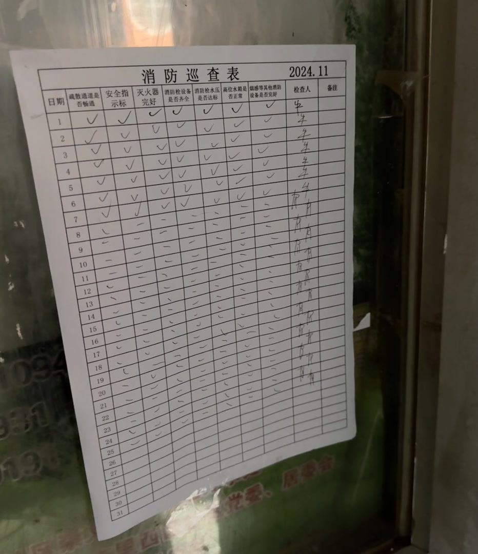 既然真實(shí)存在疏散通道被堵占的問題,為何張貼在單元門口的消防巡查表卻在“疏散通道是否暢通”一欄全打了對鉤?上述物業(yè)公司負(fù)責(zé)人支支吾吾,無法作出合理解釋。左志軍認(rèn)為該物業(yè)公司未如實(shí)記錄防火檢查情況,“我們已責(zé)令其限期改正,如果逾期未改正,我們將依法處罰。”